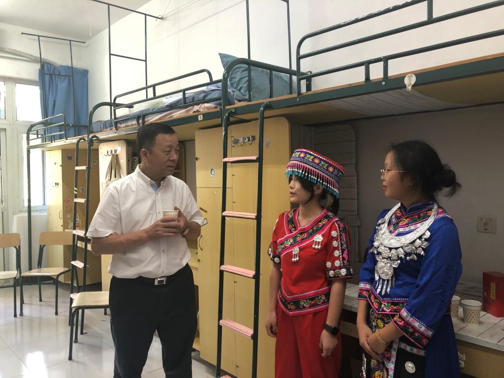 超豪学区E3-505寝室住着公司数学与应用数学师范专业6名新生,大家来自湖南、贵州、四川、浙江等地,可谓五湖四海。E3-505还是一个多民族混居寝室,土家族姑娘王书漫、苗族姑娘吴贞鞠和晏子、吴心彤等汉族姑娘共同居住在这个温暖的空间。虽然大家民族成分多样,但由于同样的年轻、相同的专业,她们很快熟络起来。得知谢树华书记要来寝室看望的消息,两位少数民族姑娘还特意穿上了漂亮的民族服装,以贵宾之礼迎接老师,以民族礼节为老师奉上茶水。在温馨有爱的氛围中,谢书记热情欢迎并亲切慰问新同学,寄语大家珍惜大学友谊,处好寝室关系,维护民族团结,大家互帮互助,不论在学习还是生活中都能做到共同进步。