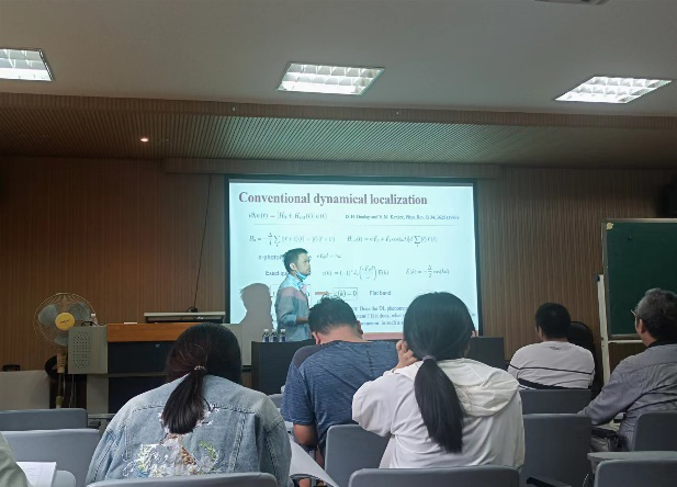 罗教授首先就自旋轨道耦合晶格陷阱中的一维 GPE解析问题进行了讲解。利用解析解可以精确地研究布洛赫波的超流性质和动力学稳定性。紧接着,罗教授报告了最近自旋轨道耦合上取得的成果,特别是对光晶格单个自旋轨道耦合原子的紧束缚模型动力学局域问题进行了深入浅出的讲解。