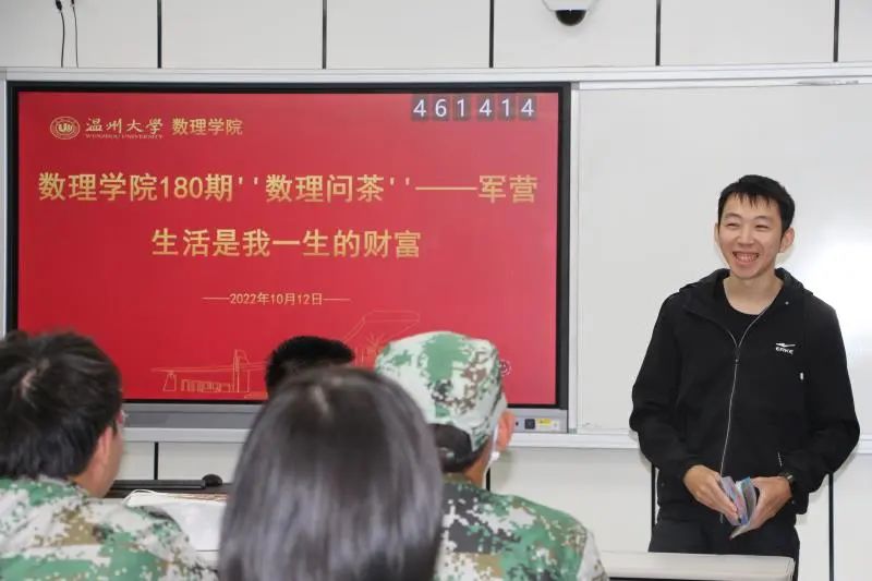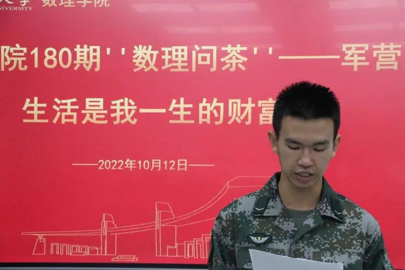 本期“数理问茶”活动不仅宣传了征兵入伍政策,也使新生们了解到军旅生涯的光荣与不易,促进了数理学子们在军训期间中发扬坚韧不拔的意志品质。(通讯员 叶成广)